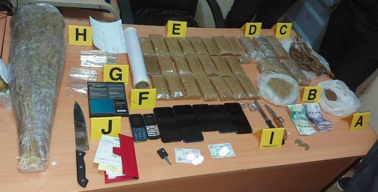 وقد جرت عملية الايقاف على إثر كمين تم تنصيبه أمام منزل المشبه به حيث اسفر ت إجراءات التفتيش من حجز 2174 غراما من مخدر الشيرا، و661 غراما من مادة الكيف الممزوج بطابا و 900 غراما من سنابل الكيف، و 75 غراما من اوراق الطابا، ومبلغ مالي يشتبه في كونه من متحصلات هذا النشاط الإجرامي فضلا عن سبعة هواتف نقالة اربعة منها مشكوك في مصدرها و ثلاثة سكاكين مختلفة الأحجام، وميزان إلكتروني وسيارة يشتبه في كونها تستعمل لتسهيل هذا النشاط الاجرامي.