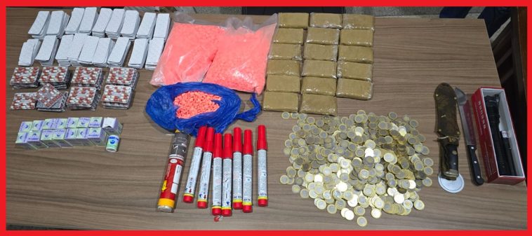 كما قادت عملية التفتيش أيضا إلى حجز صاعق كهربائي وسلاحين أبيضين، فضلا عن 7 شهب اصطناعية ودراجة نارية يشتبه في استعمالها في تسهيل هذا النشاط الإجرامي.
