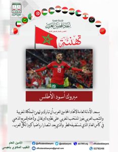 ومما ورد في نص التهنئة: “إن الأمانة العام لاتحاد المحامين العرب تعتبر أن هذا الفوز هو انجاز رياضي مغربي عربي، فتهنئ أسود الأطلس بهذا الفوز الرائع الذي هو مهدى للمغاربة والعرب على حد سواء، متمنية لهم المزيد من الحصاد، للمرور بالفوز النهائي بكأس العالم، وبالدرجة الأولى تبارك وتهنئ المملكة المغربية على ماحققه أبناؤها أسود الأطلس من فوز ساحق على أبناء القارة العجوز ، بمثل ما تهنيء وتبارك للشعوب العربية هذا الانتصار الذي يجسد ملحمة تاريخية تعود بنا إلى ما تم بناؤه من حضارة عربية في الأندلس،