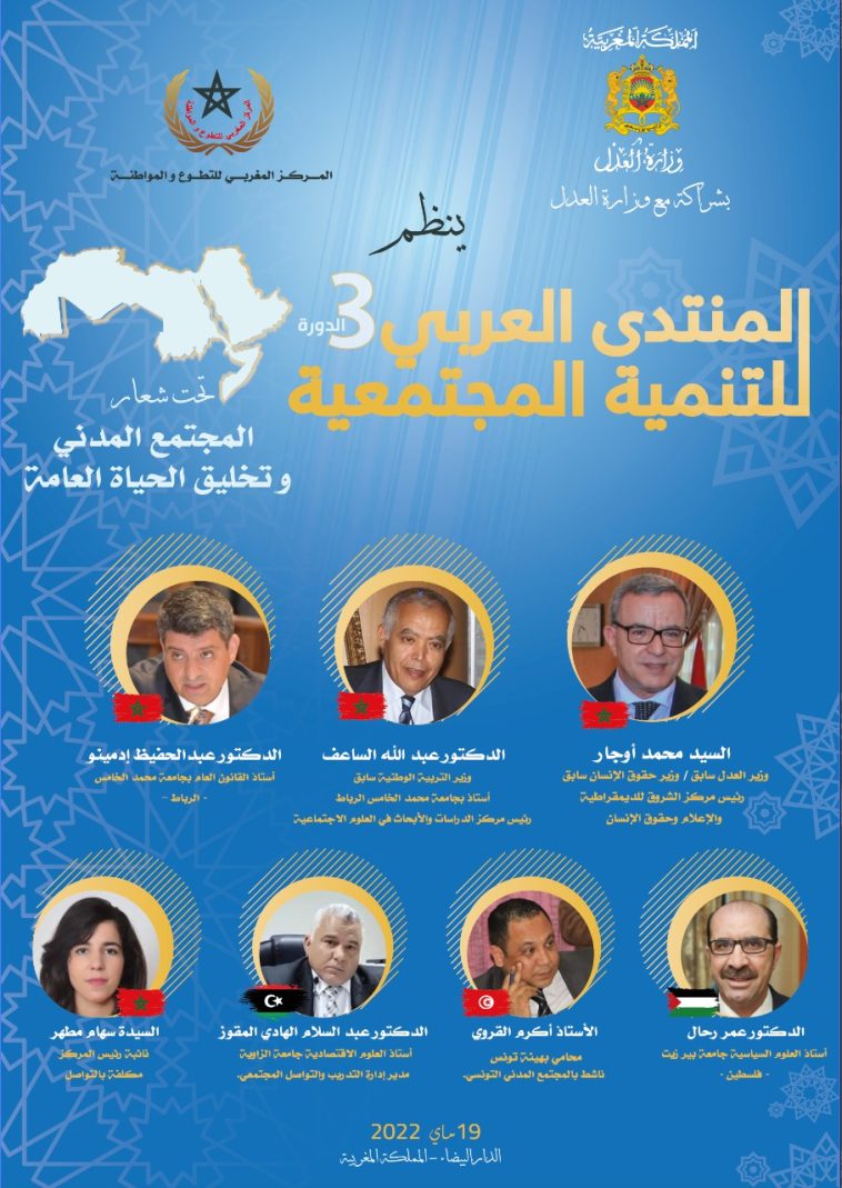 ینظم المركز المغربي للتطوع والمواطنة، بشراكة مع وزارة العدل، النسخة الثالثة للمنتدى العربي للتنمیة المجتمعیة تحت شعار “المجتمع المدني العربي ورھان المسائلة المواطنة”، وذلك يوم الخميس 19 ماي 2022 بالدار البيضاء.