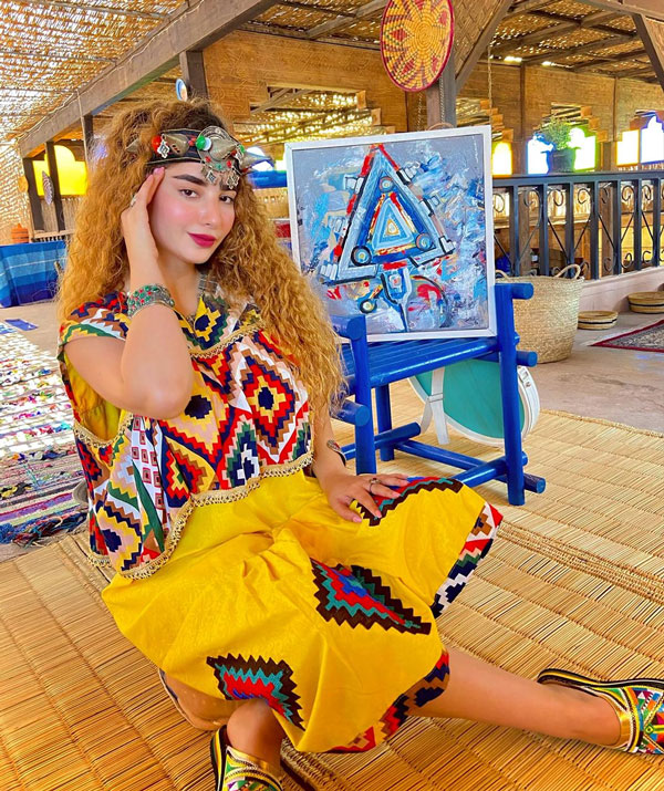 وتضيف: “أستخدم الألوان الجميلة والمتناسقة مع بعضها البعض لأكون لوحة أرسم فيها مشاعري وذكرياتي بتناسق ورشاقة”.