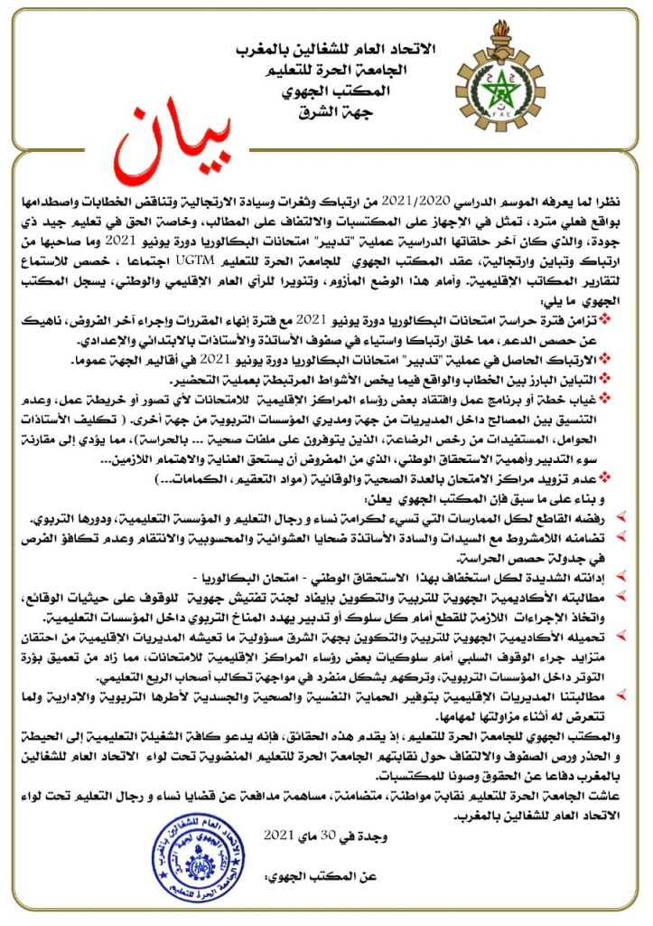 توصلت ”الحدث الشرقي” ببيان من المكتب الجهوي للجامعة الحرة للتعليم، المنضوية تحت لواء الاتحاد العام للشغالين بالمغرب، حول ”الارتباك الحاصل في عملية تدبير امتحانات البكالوريا، دورة يونيو 2021، في أقاليم الجهة عموما، هذا نصه كما ورد علينا من المصدر: