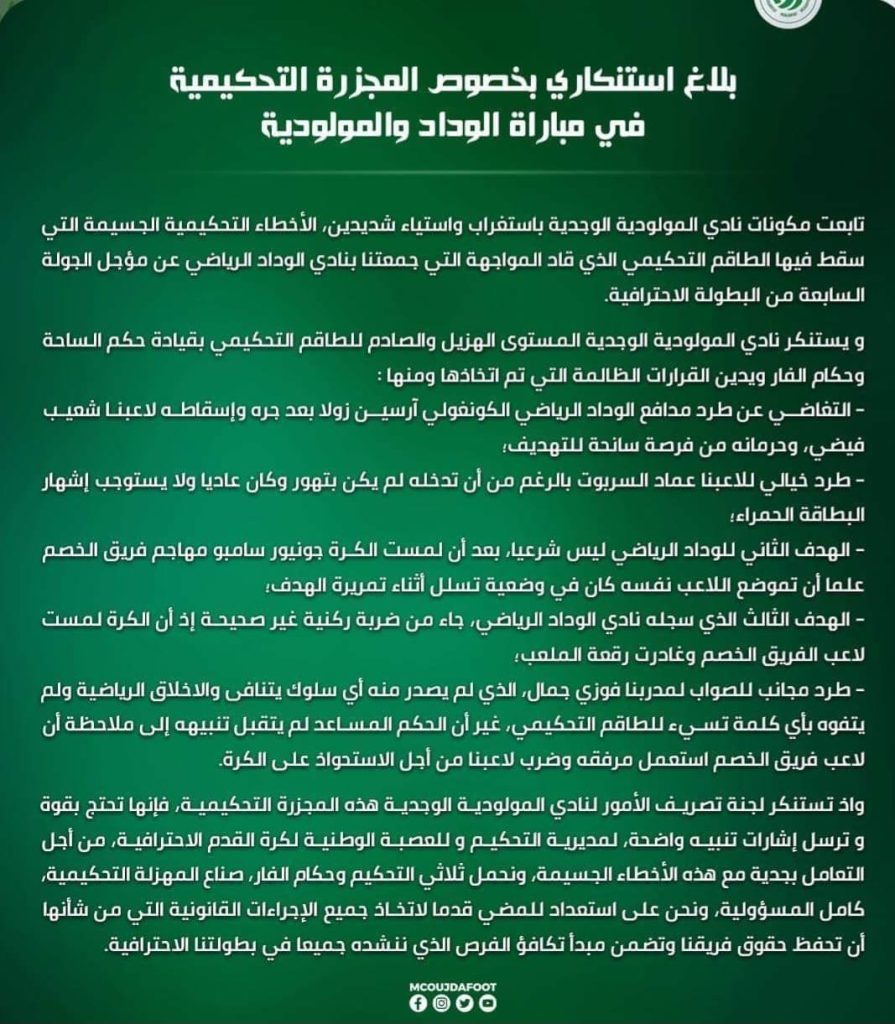 نددت لجنة تصريف الأعمال المؤقتة لفريق المولودية الوجدية لكرة القدم في بلاغ لها، نشر على الصفحة الرسمية للفريق، على موقع التواصل الإجتماعي ” فيس بوك”، بما وصفته ب ” المجزرة التحكيمية”، التي تعرض لها الفريق في مباراته المؤجلة عن الدورة السابعة، من البطولة الاحترافية الأولى ” إنوي ” للموسم الرياضي 2023/2024 ، أمام فريق الوداد البيضاوي، مغرب يوم الأربعاء 6 دجنبر الجاري، بملعب البشير بالمحمدية.