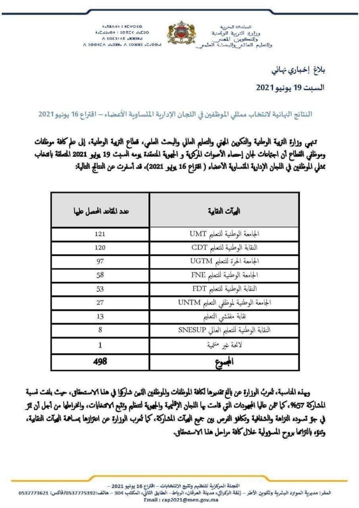 تـنهي وزارة التربية الوطنية والتكوين المهني والتعليم العالي والبحث العلمي، قطاع التربية الوطنية، إلى علم كافة موظفات وموظفي القطاع أن اجتماعات لجان إحصاء الأصوات المركزية والجهوية المنعقدة يومه السبت 19 يونيو 2021 المتعلقة بانتخاب ممثلي الموظفين في اللجان الإدارية المتساوية الأعضاء ( اقتراع 16 يونيو 2021)، قد أسفرت عن النتائج التالية: