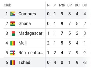 ورفع منتخب جزر القمر الذي يشرف على طاقمه الفني المدرب الإيطالي ( Stefano cusin) رصيده إلى تسع نقاط، متقدما بفارق النسبة العامة على منتخب غانا الذي يملك الرصيد ذاته.