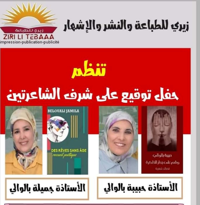نظمت تعاونية زيري للطباعة والنشر والإشهار بعد ظهر يوم الثلاثاء 16 نونبر الجاري، حفل توقيع ديواني شعر للشقيقتين الشاعرتين، بالوالي حبيبة وجميلة، بنادي الأعمال الاجتماعية لهيئة التعليم بوجدة.