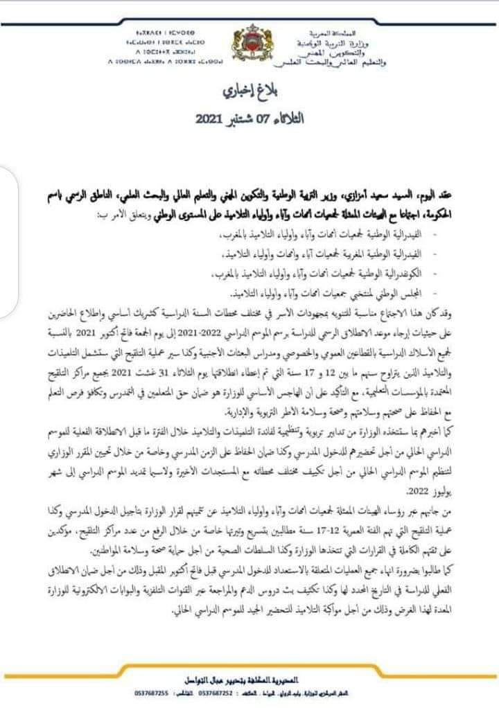 وحسب بلاغ إخباري تم تعميمه بعد اجتماع عقده الوزير عبر تقنية المناظرة المرئية، مع الهيئات الممثلة لقطاع التعليم المدرسي الخصوصي على المستوى الوطني، فقد تقرر إعادة برمجة مواعد العطل والامتحانات المدرسية وتمديد الموسم الدراسي إلى غاية شهر يوليوز 2022 وذلك حفاظا على الزمن المدرسي، ومن أجل تحضير كافة التلميذات والتلاميذ التعليم العمومي والخصوصي للدخول المدرسي الحالي