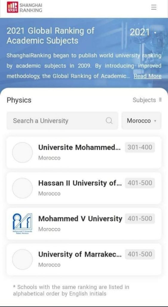 أفضت نتائج التصنيف العالمي شنغهاي للحقول المعرفية إلى تصنيف 4 جامعات مغربية في مراكز متقدمة ضمن أفضل 500 جامعة عالميا في تخصص علوم الفيزياء، ليحتل المغرب المرتبة الأولى من حيث عدد الجامعات المصنفة عربيا وإفريقيا.