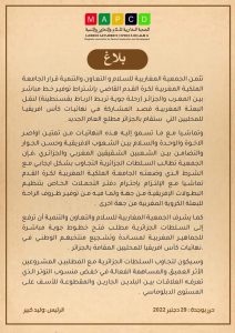 وطالبت الجمعية التي يرأسها الإعلامي الجزائري وليد كبير السلطات الجزائرية التجاوب بشكل إيجابي مع الشرط الذي وضعته الجامعة الملكية المغربية لكرة القدم، تماشيا مع الالتزام باحترام دفتر التحملات الخاص بتنظيم البطولات الإفريقية من جهة، ولما فيه من توفير ظروف الراحة للبعثة الكروية المغربية من جهة أخرى، تماشيا مع ما تسمو إليه هذه النهائيات من تمتين أواصر الأخوة والوحدة والسلام بين الشعوب الإفريقية، وحسن الجوار والتضامن بين الشعبين الشقيقين المغربي والجزائر.
