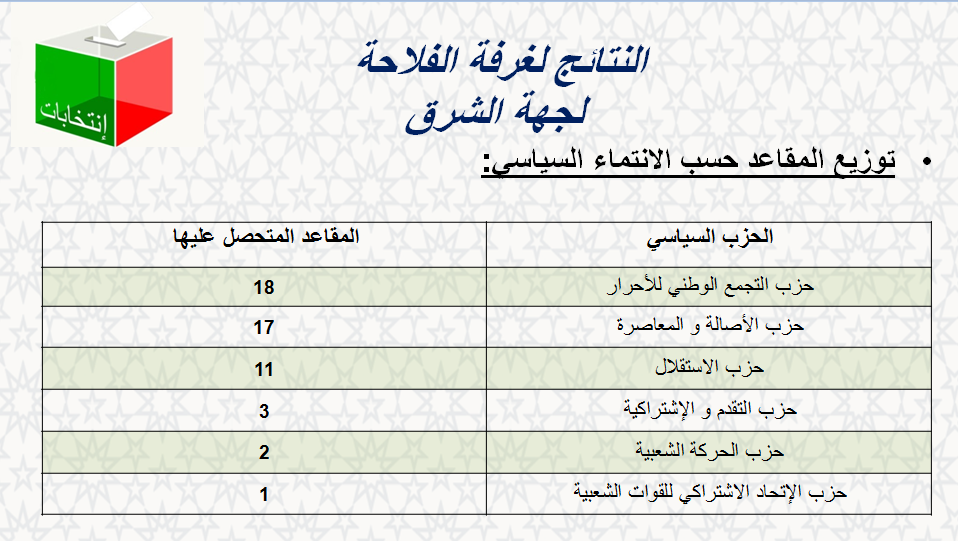 هذا وبلغ عدد المصوتين بغرفة الفلاحة على مستوى جهة الشرق 41637 من أصل 89395 مجموع الناخبين، بنسبة 46،58 %، موزعين على 49 دائرة انتخابية، فيما بلغ عدد المقاعد المتنافس عليها 52 منها 03 للنساء. واحتل حزب ”الحمامة” المرتبة الأولى، بـ 18 مقعدا، بفارق مقعد واحد فقط عن وصيفه ”الجرار ” الذي حصل على 17 مقعدا، تلاه ”الميزان” بـ 11 مقعدا، ثم ”الكتاب ” بـ 03 مقاعد، و”السنبلة ” بمقعدين اثنين، و”الوردة ” بمقعد واحد.