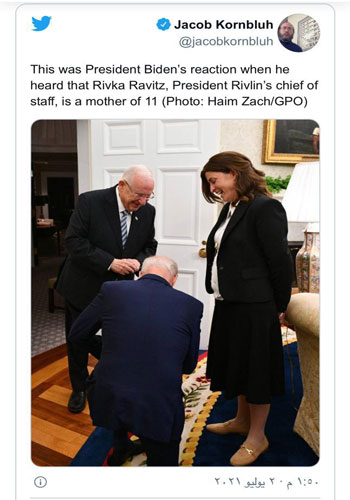 أحدثت صورة ظهر فيها الرئيس الأمريكي جو بايدن راكعا أمام ريفكا رافيتز مديرة مكتب الرئيس الإسرائيلي المنتهية ولايته رؤوفين ريفلين، ضجة على مواقع التواصل الاجتماعي.