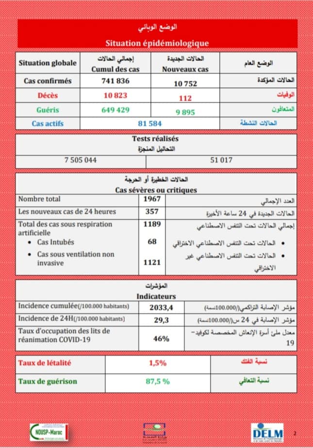 أما على المستوى الوطني، فقد أعلنت وزارة الصحة، اليوم الجمعة، عن تسجيل 10.752 حالة إصابة جديدة بفيروس كورونا المستجد (كوفيد-19)، و9895 حالة شفاء، و112 حالة وفاة خلال الـ 24 ساعة المنصرمة.