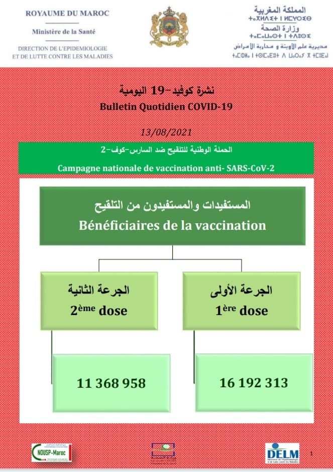 أما العدد الإجمالي للمستفيدات والمستفيدين من الحملة الوطنية للتلقيح ضد “كوفيد 19″، فقد أكدت وزارة الصحة أنه بلغ إلى حدود اليوم 16 مليون و192 ألفا و313 مستفيدة ومستفيد، فيما يتعلق بمن تلقوا الجرعة الأولى من التلقيح، في حين وصل عدد المستفيدين من الجرعة الثانية من اللقاح، إلى 11 مليون و368 ألفا و958 مستفيدة ومستفيد.
