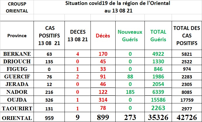 وخلف كوڤيد ـ 19 حصيلة ثقيلة في الأرواح، حيث تم تسجيل 09 وفيات، 04 منها ببركان، وحالتي وفاة اثنتين بڭرسيف، وحالة واحدة في كل من فڭيڭ ووجدة ووتاوريرت، ليرتفع إجمالي الوفيات إلى 899 حالة وفاة.