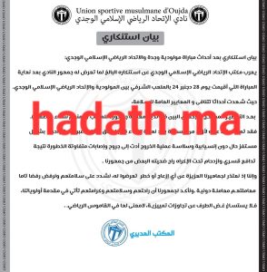 أصدر المكتب المسير لفريق الإتحاد الرياضي الإسلامي الوجدي لكرة القدم، بلاغا شديد اللهجة، ضد ما وصفه بالتقصير الممنهج، وسوء تدبير عملية مغادرة أنصاره للملعب الشرفي، عقب نهاية المباراة المحلية التي جمعت المولودية الوجدية والاتحاد الرياضي الإسلامي الوجدي ( 0-0)، بعد ظهر يوم السبت الأخير 28 دجنبر 2024, برسم الجولة 11 من بطولة المجموعة الوطنية الثانية، دون تحديد الجهة المسؤولة عما وقع.