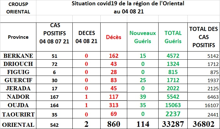 رقم قياسي غير متوقع ذلك الذي سجلته جهة الشرق في عدد الإصابات المؤكدة الجديدة بفيروس كورونا المستجد، خلال الـ 24 ساعة الأخيرة، حيث أعلنت المديرية الجهوية لوزارة الصحة بجهة الشرق، اليوم الأربعاء 04 غشت 2021، عن 542 حالة إصابة جديدة، ارتفع بموجبها مجموع الإصابات منذ ظهور الوباء إلى 36802 حالة.