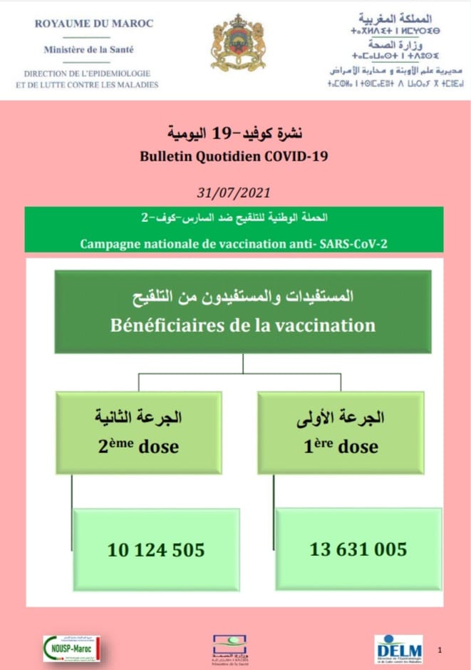 أما العدد الإجمالي للمستفيدات والمستفيدين من الحملة الوطنية للتلقيح ضد “كوفيد 19″، فقد أكدت وزارة الصحة أنه بلغ إلى حدود اليوم 13 مليون و613 ألفا و5 مستفيدة ومستفيد، فيما يتعلق بمن تلقوا الجرعة الأولى من التلقيح، في حين وصل عدد المستفيدين من الجرعة الثانية من اللقاح، إلى 10 ملايين و124 ألفا و505 مستفيدة ومستفيد.