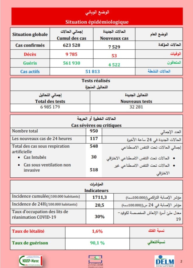 وأوضحت وزارة الصحة، في النشرة اليومية لنتائج الرصد الوبائي لكوفيد-19، أن الحصيلة الجديدة المسجلة من الساعة الرابعة من مساء أمس الجمعة إلى الساعة الرابعة من مساء اليوم، رفعت العدد الإجمالي لحالات الإصابة المؤكدة بالمملكة إلى 623.528، منذ الإعلان عن أول حالة في 2 مارس 2020.