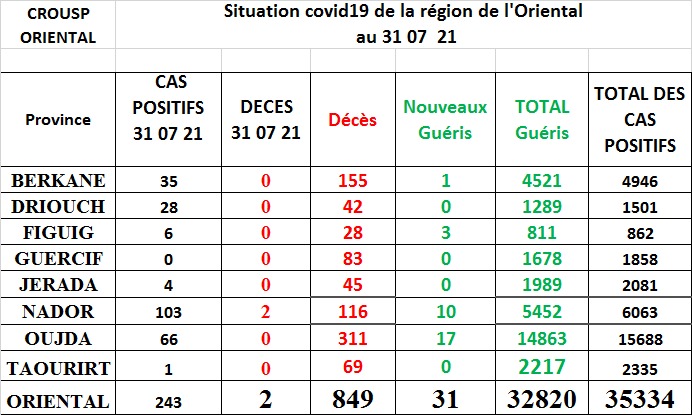 ما زال عداد كورونا مستمرا في تصاعده المقلق بجهة الشرق، فيما تسير نسبة التعافي بمهل وتؤدة لم تتمكن مسايرة إيقاع حالات الإصابة في عددها، حيث أعلنت المديرية الجهوية لوزارة الصحة بجهة الشرق، اليوم السبت 31 يوليوز 2021، عن تسجيل 243 حالة إصابة مؤكدة جديدة، ارتفع بموجبها مجموع الإصابات منذ ظهور الوباء إلى 35334 حالة.