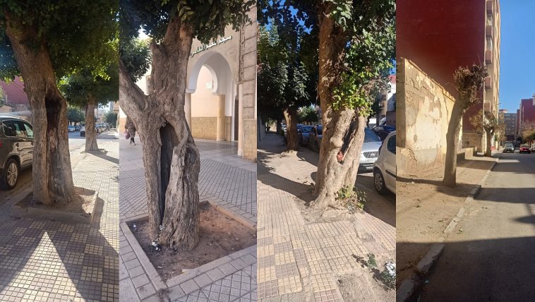 شاخت جلُّ أشجار شوارع مدينة وجدة وأزقتها التي تؤرخ لبداية حقبة الاستعمار وفرغت أجوافها ومالت فروعها ولم يعدْ يشدُّ أغضانها إليها إلا قشرتها الخارجية وأصبحت تتهاوى كأوراقها في الخريف كلمّا هبت عواصف رملية ورياح قوية بل خفيفة وحتى بدونها، وتتهاوى كجذوع نخل خاوية على سيارات المواطنين المتوقفة على جانب الأرصفة بشوارع المدينة، دون الحديث عن الأخطار التي تشكلها على المارة والراجلين المستعملين للأرصفة والطرقات كما تهدد حياة الأطفال الذين غالبا ما يلهون ويركضون ويختبؤون خلفها أو تحتها.