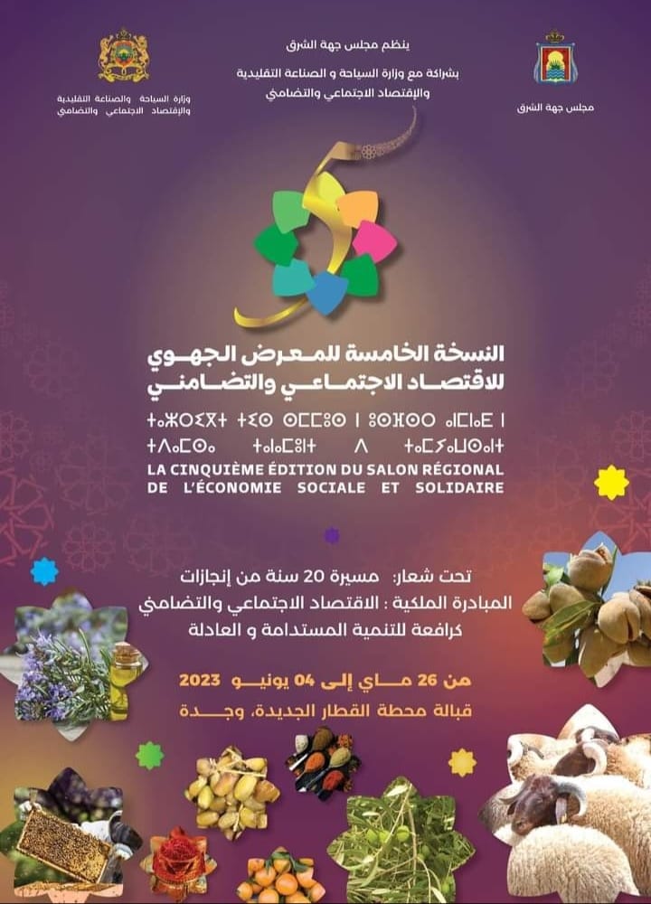 ينظم مجلس جهة الشرق بشراكة مع وزارة السياحة والصناعة التقليدية والاقتصاد الاجتماعي والتضامني، النسخة الخامسة للمعرض الجهوي للإقتصاد الاجتماعي والتضامني تحت شعار: “مسيرة 20 سنة من إنجازات المبادرة الملكية: الاقتصاد الاجتماعي والتضامني كرافعة للتنمية المستدامة والعادلة”، في الفترة الممتدة من 26 ماي إلى غاية 04 يونيو 2023 بمدينة وجدة.
