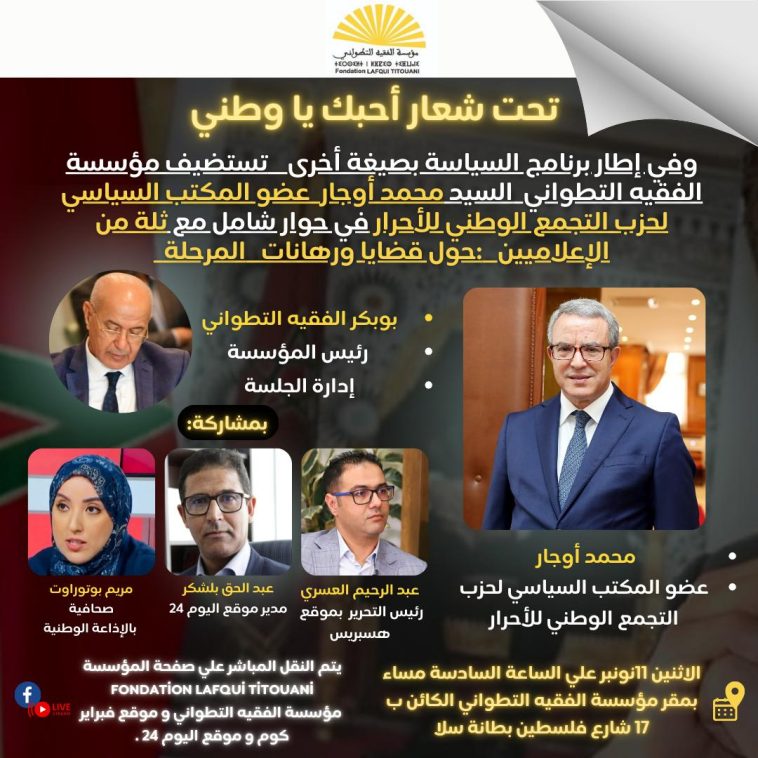 سيحل محمد اوجار عضو المكتب السياسي لحزب التجمع الوطني للأحرار و المنسق الجهوي الحزب بجهة الشرق، مساء هذا اليوم الاثنين 11 نونبر 2024 ضيفا على مؤسسة الفقيه التطواني في حوار شامل مع ثلة من الاعلاميين حول قضايا ورهانات المرحلة بمشاركة عبد الرحيم العسري رئيس تحرير بموقع هسبريس وعبد الحق بالشكر مدير موقع اليوم 24 وكريم بوتوراوت صحافية بالإذاعة الوطنية يدير الجلسة رئيس المؤسسة بوبكر الفقيه التطواني. وسيتم نقل الحوار على موقع المؤسسة وموقع فبراير كم وموقع اليوم 24.
