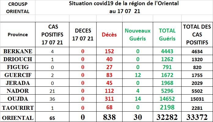 وهذا جدول توضيحي لحالات الإصابة والشفاء والوفيات حسب أقاليم جهة الشرق: