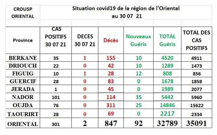وهذا جدول توضيحي لحالات الإصابة والشفاء والوفيات حسب عمالة وأقاليم جهة الشرق: