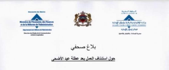 أعلن قطاع إصلاح الإدارة – وزارة الاقتصاد والمالية وإصلاح الادارة- عن استئناف العمل في الإدارات العمومية والجماعات الترابية والمؤسسات العمومية يوم الجمعة 23 يوليوز بعد عطلة عيد الأضحى.