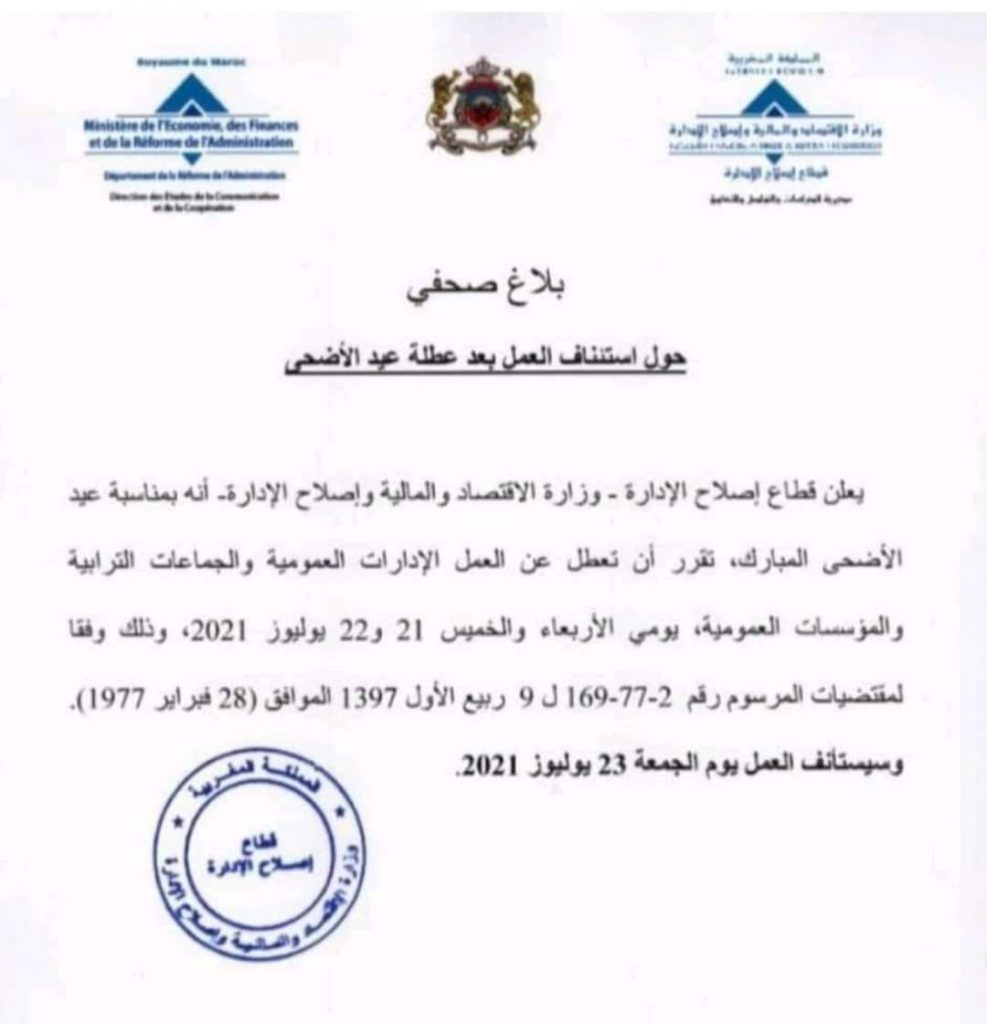 وذكر بلاغ لوزارة الاقتصاد والمالية وإصلاح الإدارة أنه تقرر بمناسبة عيد الأضحى أن تعطل عن العمل الإدارات العمومية والجماعات الترابية والمؤسسات العمومية يومي الأربعاء والخميس 21 و 22 يوليوز 2021، وذلك وفقا لمقتضيات المرسوم رقم 2-77 -169 لـ 9 ربيع الأول 1397 الموافق لـ 28 فبراير 1977.