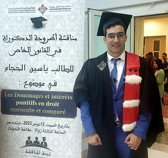 نال الطالب الباحث ياسين الحجام شهادة الدكتوراه في القانون الخاص، بميزة مشرف جدا، في موضوع: Les dommages et intérêts punitifs en droit marocain et comparé، اليوم السبت 12 نونبر 2022، برحاب قاعة الندوات بكلية العلوم القانونية والاقتصادية والاجتماعية بجامعة محمد الأول بوجدة.
