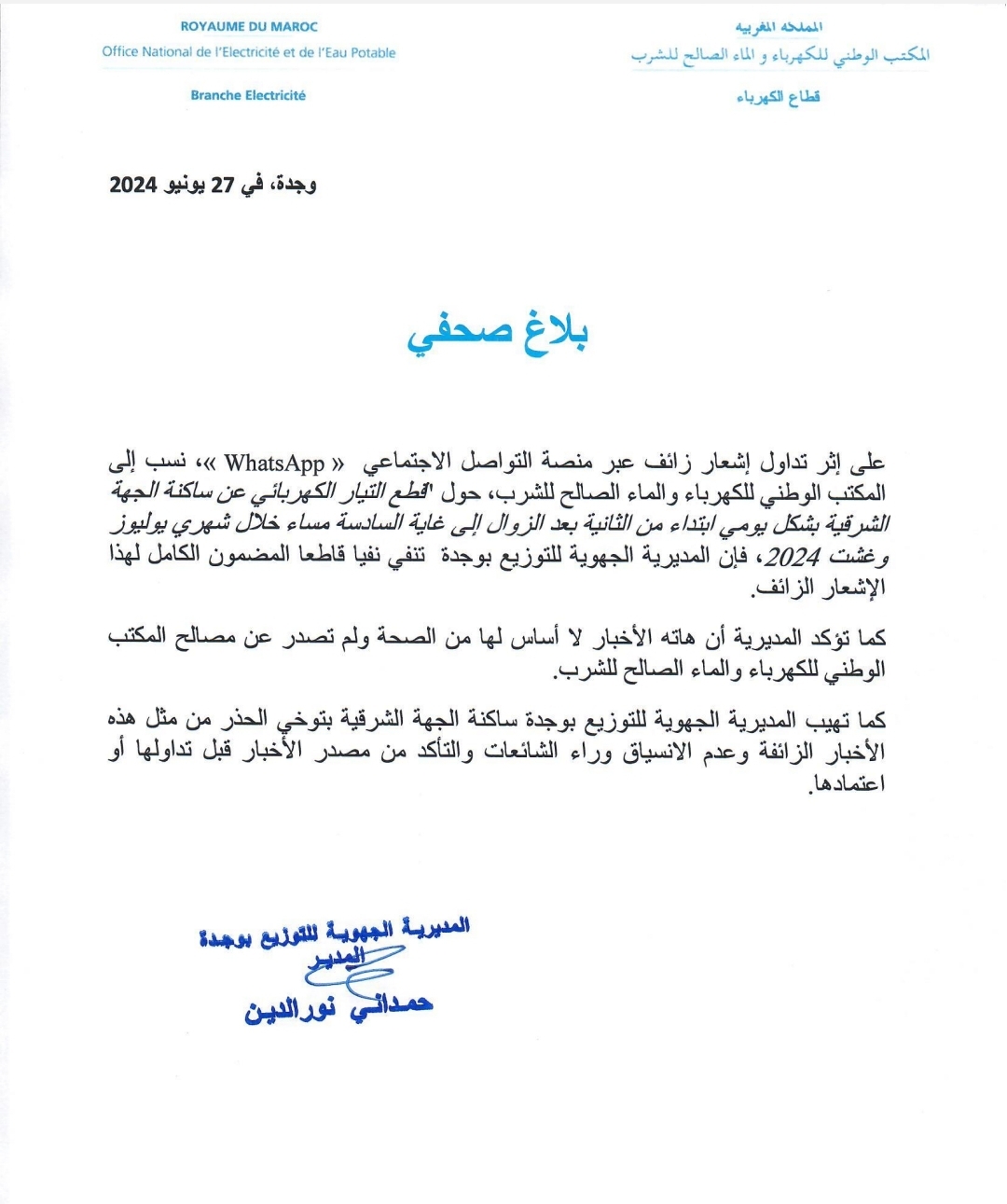 أصدرت المديرية الجهوية للتوزيع التابعة للمكتب الوطني للكهرباء والماء الصالح للشرب، قطاع الكهرباء، بلاغا صحفيا، تفند فيه جملة وتفصيلا ما تضمنته أحد الإشعارات الزائفة التي تم تداولها عبر منصات التواصل الاجتماعي “الواتساب”، منسوب إلى المكتب الوطني للكهرباء والماء الصالح للشرب -قطاع الكهرباء- حول قطع التيار الكهربائي عن ساكنة الجهة الشرقية بشكل يومي، ابتداء من الثانية بعد الزوال إلى غاية السادسة مساء، خلال شهري يوليوز وغشت 2024.