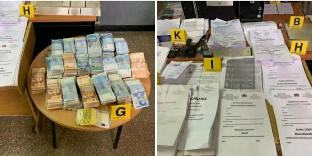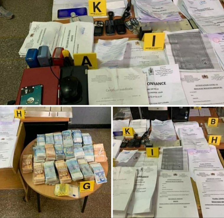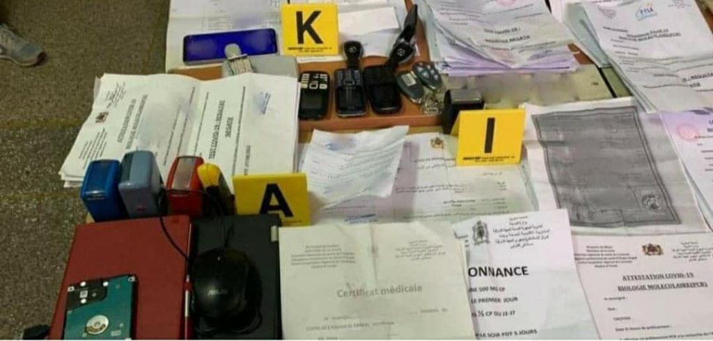 وأضاف البلاغ أن عمليات التفتيش المنجزة بمنازل المشتبه فيهم بمدينة وجدة أسفرت عن ضبط العشرات من شواهد الاختبارات المزورة للكشف عن وباء كوفيد-19، منها مطبوعات فارغة وأخرى تتضمن نتائج سلبية مزورة، ومعدات معلوماتية ودعامات رقمية، ومبالغ مالية بالعملة الوطنية تتجاوز 875 ألف درهم وأخرى بالعملة الأوروبية، فضلا عن طابع يحمل صفة طبيب في مستشفى جامعي، علاوة على خمس أسلحة بيضاء وسيارة وأربع صفائح معدنية للسيارات مشكوك فيها.