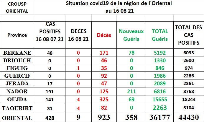 هذا وأعلنت المديرية الجهوية لوزارة الصحة بجهة الشرق، اليوم الإثنين 16 غشت 2021، عن تماثل 354 مصابا بكوڤيد ـ 19 للشفاء التام، منهم 211 بإقليم الناظور، و 78 بإقليم بركان، و 69 بعمالة وجدة ـ أنڭاد، ليرتفع إجمالي حالات التعافي إلى 36177 حالة شفاء.