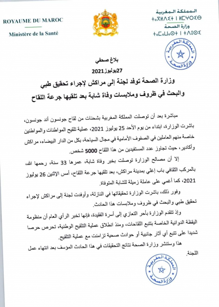 وقالت الوزارة، بعدما تقدمت بأحر التعازي إلى أسرة الفقيدة، وهي شابة تبلغ من العمر 33 سنة، مستخدمة بأحد الفنادق بالمدينة الحمراء، إنه “مباشرة بعد أن توصلت المملكة المغربية بشحنات من لقاح جونسون أند جونسون، باشرت الوزارة، ابتداء من يوم الأحد 25 يوليوز 2021، عملية تلقيح المواطنات والمواطنين خاصة منهم العاملين في الصفوف الأمامية في مجال السياحة، بكل من الدار البيضاء، مراكش وأكادير، حيث تجاوز عدد المستفيدين من هذا اللقاح 5000 شخص”.