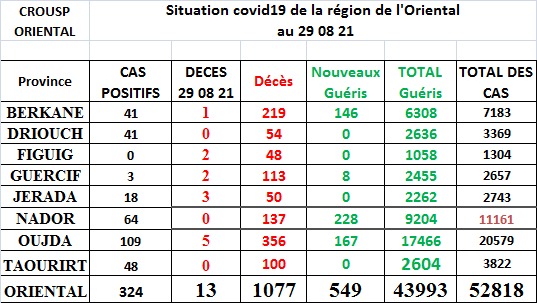 ارتفاع في عدد الأموات قابله انخفاض نسبي في الإصابات المؤكدة الجديدة، حيث أعلنت المديرية الجهوية لوزارة الصحة بجهة الشرق، اليوم الأحد 29 غشت 2021، عن رصد 324 حالة إصابة جديدة، ارتفع بموجبها إجمالي الإصابات إلى 52818 حالة.