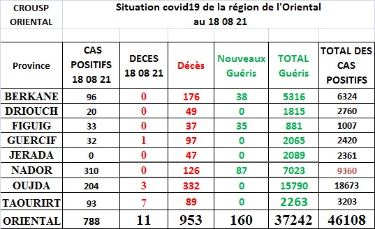 وهذا هو توزيع حالات الإصابة والشفاء والوفيات حسب عمالة وأقاليم جهة الشرق:
