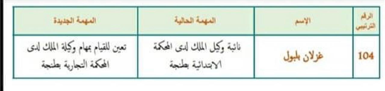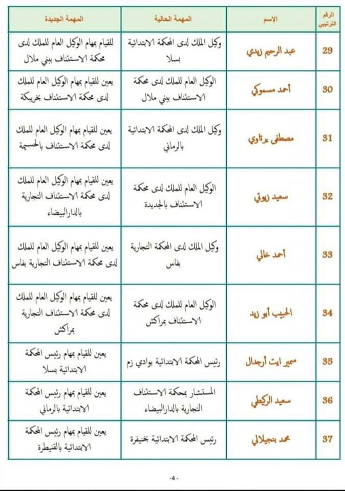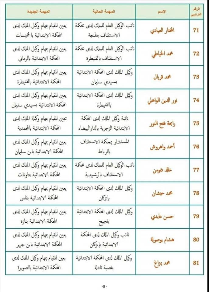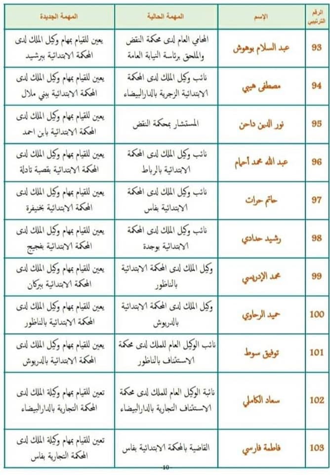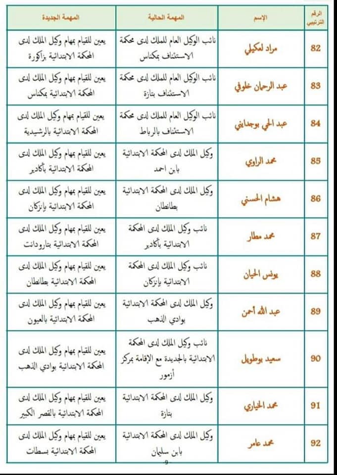 وشملت أيضا تعيين رئيس محكمة تجارية ورئيس محكمة إدارية، فضلا عن 32 وكيلا للملك لدى محتاكم ابتدائية منهم 13 كانوا يشتغلون نفس المهمة لدى محاكم أخرى، و3 وكيلات للملك لدى محاكم تجارية.
