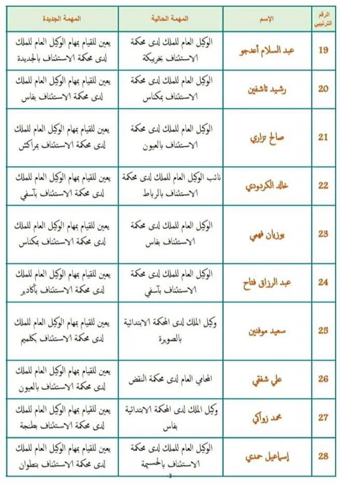 وتوزعت أيضا بين تعيين 18 وكيلا عاما للملك لدى محاكم استئنافية منهم 10 كانوا يشتغلون نفس المهمة لدى محاكم استئنافية أخرى، و5 كانوا يشتغلون مهمة وكيل الملك لدى محاكم ابتدائية، بالإضافة إلى 33 رئيس محاكم ابتدائية، منهم 11 كانوا يشتغلون نفس المهمة بمحاكم ابتدائية.
