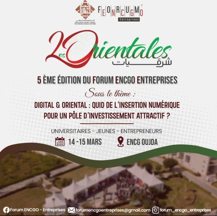 في إطار الاحتفال بمرور عشرين سنة عن الخطاب السامي لصاحب الجلالة الملك محمد السادس نصره الله بمدينة وجدة يوم 18 مارس 2003، تنظم المدرسة الوطنية للتجارة والتسيير، النسخة الخامسة من منتدى المقاولات للمدرسة، وذلك يومي 14 و 15 مارس 2023 بمقر المدرسة، حول موضوع:”الرقمنة وجهة الشرق من أجل قطب استثماري جذاب”